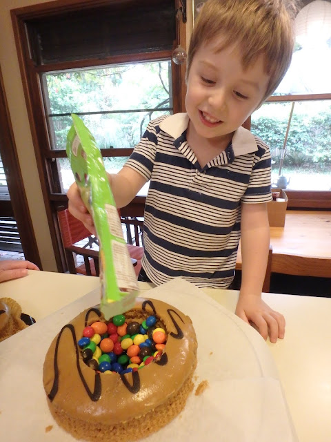They bought a couple of caramel cakes then got to work... firstly make a hole in the bottom cake then stuff with M&M's and Sour Watermelon Jellies... yes Bri did take the metal ring out before putting the top on.